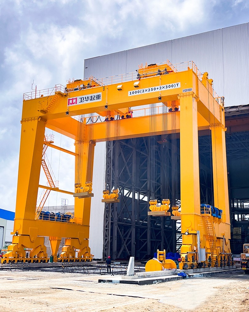 根据项目起吊重量大、工况复杂、控制精度高等特点,世界杯官网中文版起重机采用U型门架结构,双龙门四点吊装,最大起吊重量1000t,最大吊点高度大于18m,采用变频+PLC控制,可实现横向、纵向距离可调,及吊梁自由旋转,控制精度达±1mm。
